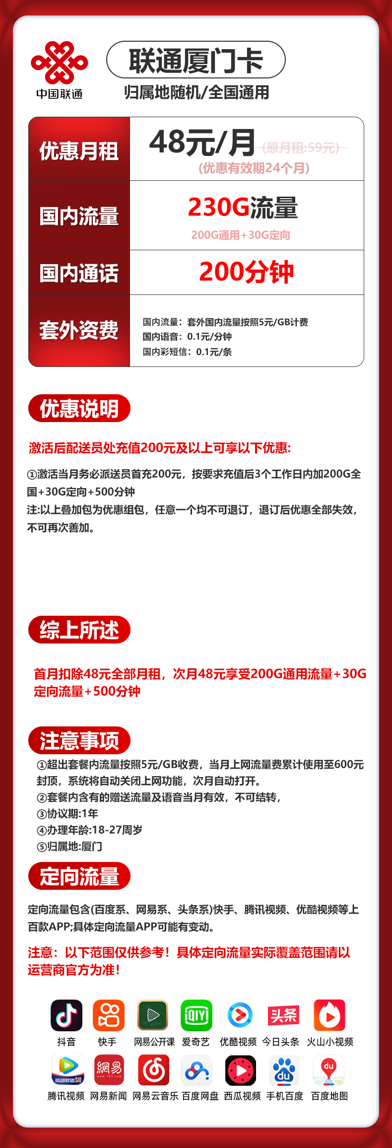 资费:厦门联通48元230G流量500分钟通话