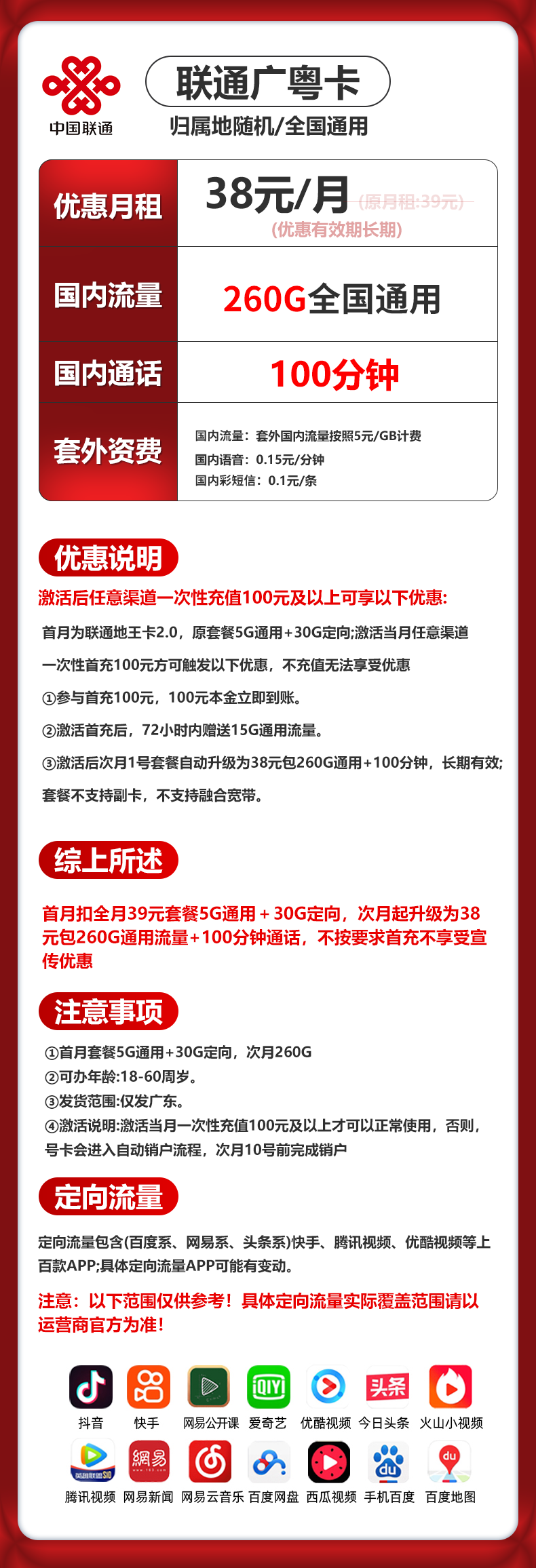 资费:广东联通38元260G通用100分钟,次月生效套餐